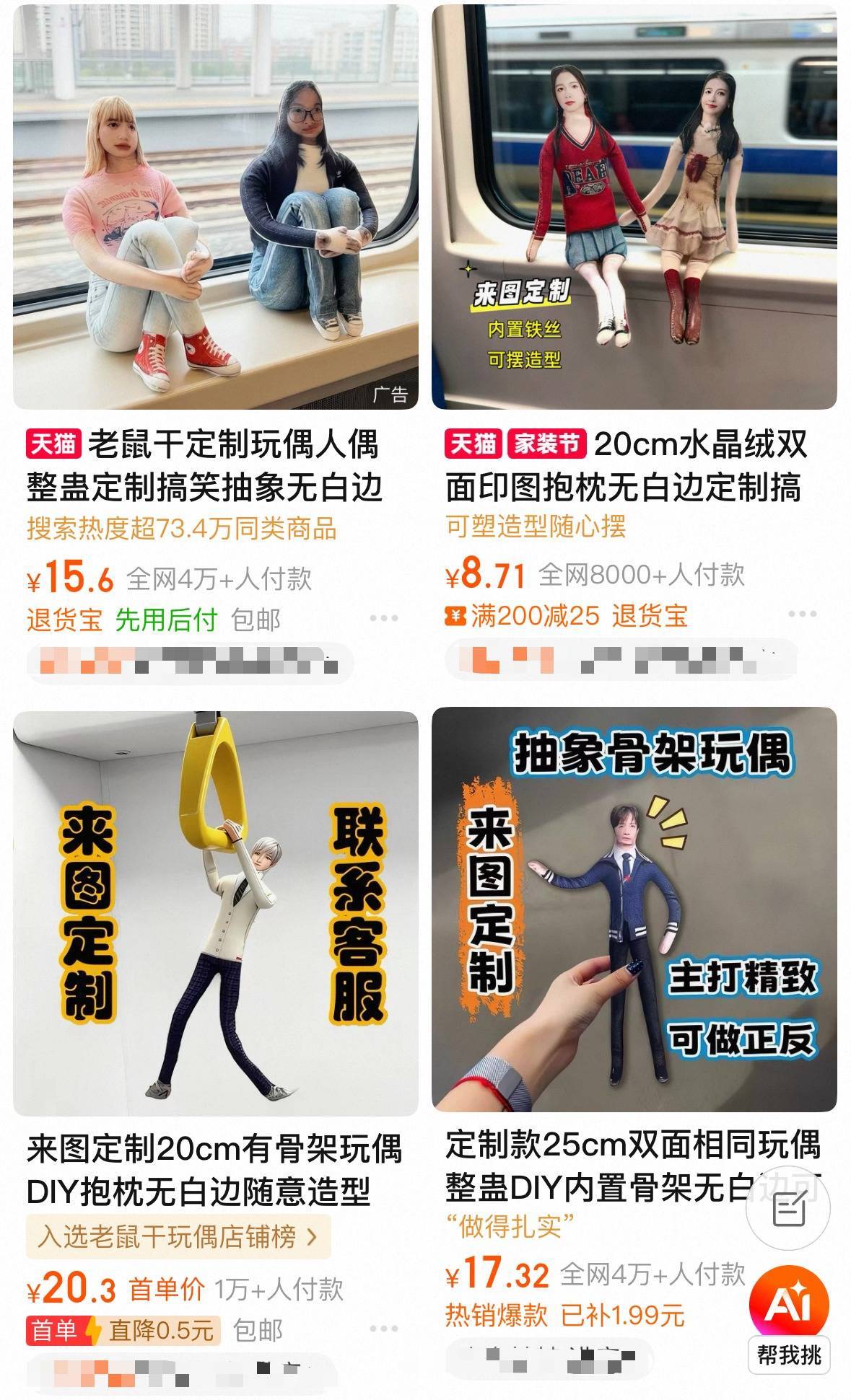潮新闻记者从电商平台了解到,这类“老鼠干”价格十分亲民,尺寸多在15至30厘米之间,定制价格从几块到十几元不等,支持将动漫角色、同学照片等定制成专属玩偶。